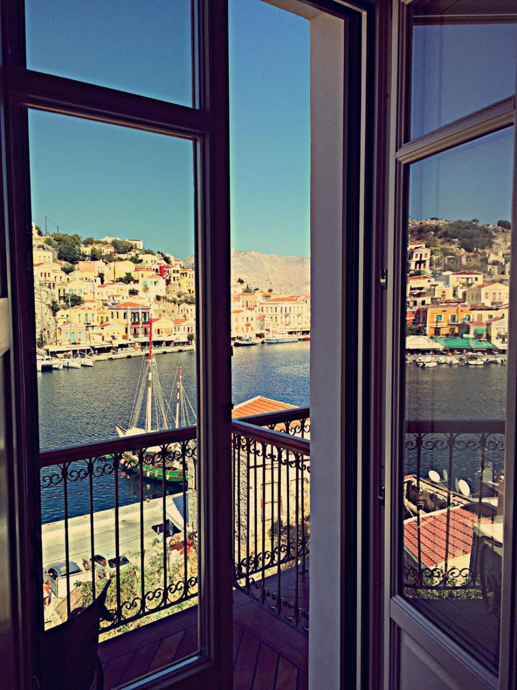 Double Room. Located on the first floor, this air-conditioned room overlooks Symi Port and the Aegean Sea from its balcony. Fitted with wooden floors and orthopedic mattresses, it features: - free Wi-Fi - flat-screen, satellite TV - mini fridge - hairdryer - free coffee, tea, bottled water - free bottle of wine upon arrival. ;