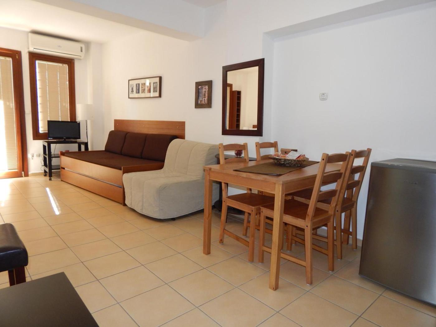 Studio with Terrace. Opening to a spacious yard, this studio includes: -free WiFi -a flat-screen TV -a kitchenette with a fridge, while a mini oven can be provided upon request. -a bathroom with a small bath, and a hairdryer. ironing facilities is available upon request. Please note that the 4th guest is accommodated in a bed, stored under the single bed. Due to ground inclination, this room type is located in both the ground floor and the basement depending on access point. Kindly note that this room type can accommodate an extra bed, upon request and at extra charge. A free baby cot for a child up to 2 years old can be provided upon request (see hotel policies). ;